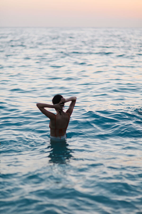 Laying on your back, you observe the point where the line of your umbrella ends and the summer blue sky begins. The warm colours of the noon turn this moment into a cinematic scene. The heat urges you to cross the loose boundary between the land and the sea. You dive into the refreshing waters. You let yourself float.